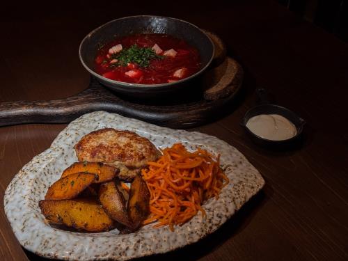 - Котлета з картоплею по-селянськи та морквою по-корейські
