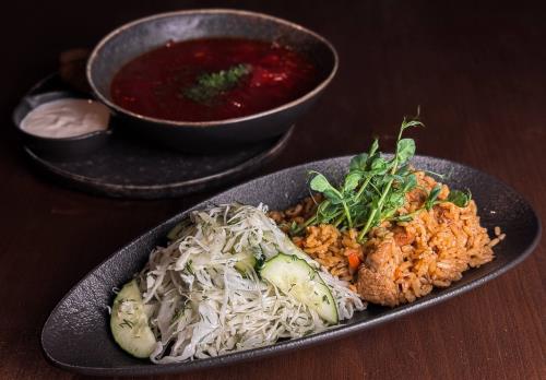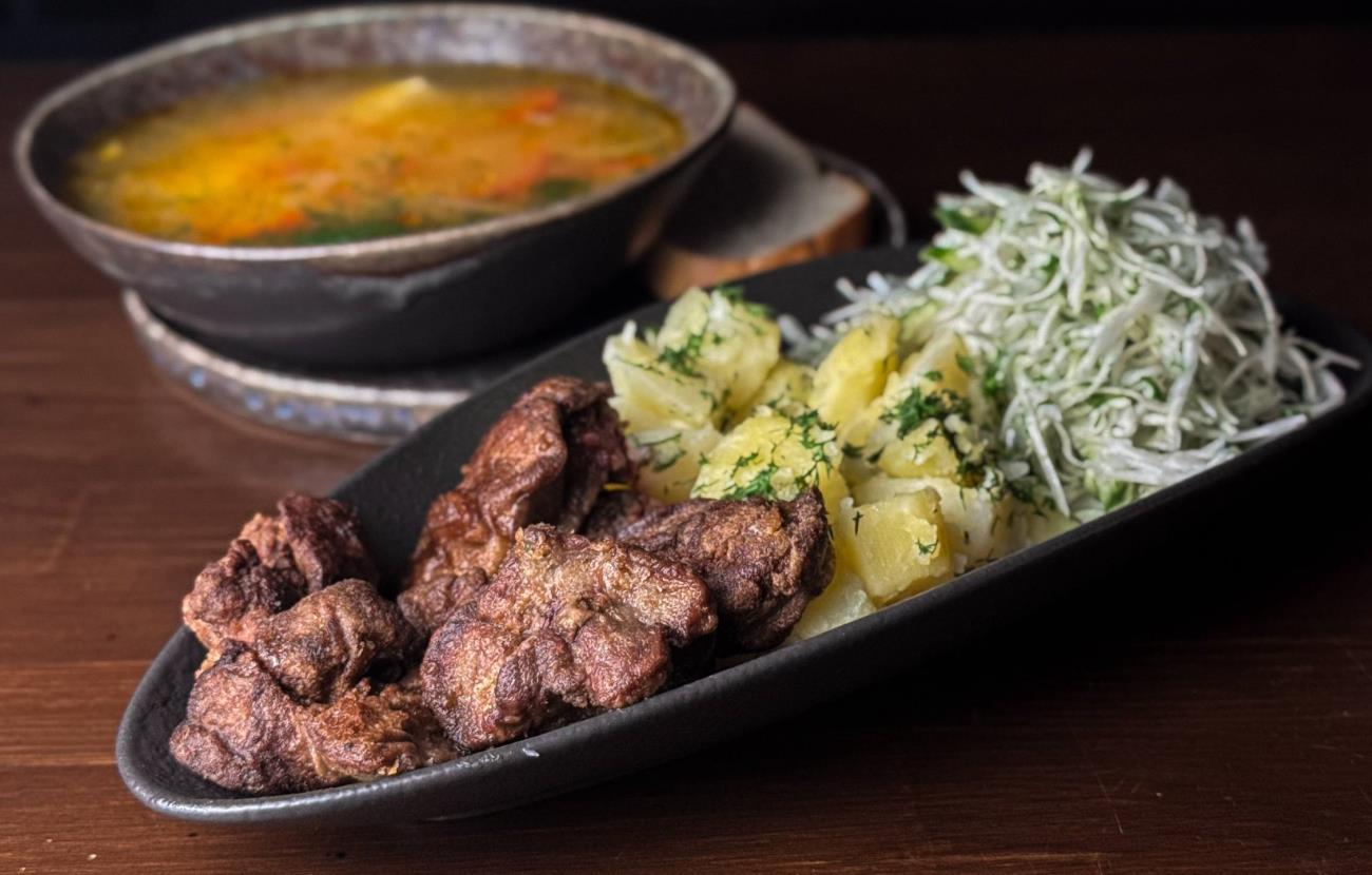 - Смажена печінка з відварною картоплею та салатом з капусти