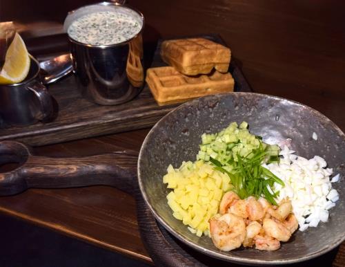 Креветки гриль, яйцо куриное, огурец свежий, зелень, картофель, сметана, минеральная вода, майонез, лук зеленый, горчица, лимон.